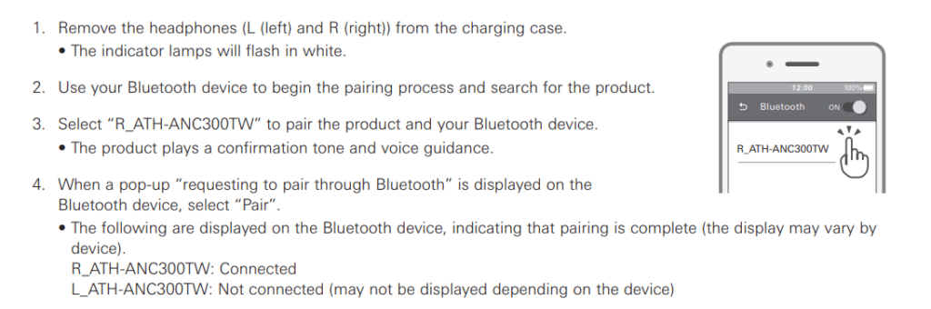 Home Audiophile Earbuds Manuals The Audio-Technica ATH-ANC300TW earbuds have Qualcomm aptX audio, AAC, and SBC support, a 5.8mm dynamic driver, Bluetooth 5.2 with a working range of 10 meters, 4.5 hours of battery life + 11.5 hours using the charging case, and much more. Learn how to use these earbuds using this manual! What's Inside ToggleAudio-Technica ATH-ANC300TW Manual & InstructionsHow to Pair The Earbuds?How to Wear?How to Turn On and Off?How to Control? / How to Operate? – InstructionsHow to Activate The Mono Mode?How to Charge The Earbuds?How to Reset The Earbuds?What Do The Lights Mean?The Earbud’s Voice PromptsA Guide To Audio-Technica ATH-ANC300TW APPSome Common Problems & TroubleshootingFAQs Audio-Technica ATH-ANC300TW Manual & Instructions How to Pair The Earbuds? To iOS and Android phones Step 1: Open the lid of the charging case and take the earbuds out. After that, the “Power on” voice prompt sounds, a white light will turn on and start flashing, and they will turn on automatically. Also, you can press the multifunction touch button on both earbuds. When a light starts flashing quickly, it means that the earbuds will be ready to pair with any device, and a light flashing twice every second means that they are waiting for the connection. Step 2: Turn on Bluetooth on the desired device. Step 3: Go to the device’s Bluetooth settings. Step 4: Select “R_ATH-ANC300TW”. If a password is needed, type “0000”. A light will start flashing every second. After that, the “Bluetooth is connected” prompt sound will appear, and the pairing will be done. To PC (Windows) Step 1: Turn on Bluetooth on the desired device. Step 2: Go to the settings. Step 3: Go to “Bluetooth and other devices”. Step 4: Click on “Add device”. Step 5: Open the lid of the charging case and take the earbuds out. After that, the “Power on” voice prompt sounds, a white light will turn on and start flashing, and they will turn on automatically. Also, you can press the multifunction touch button on both earbuds. When a light starts flashing quickly, it means that the earbuds will be ready to pair with any device, and a light flashing twice every second means that they are waiting for the connection. Step 6: Select “R_ATH-ANC300TW”. If a password is needed, type “0000”. A light will start flashing every second. After that, the “Bluetooth is connected” prompt sound will appear, and the pairing will be done. Credits: Audio-Technica How to Wear? Step 1: Take both earbuds out of the charging case. Step 2: Identify the left and right earbuds. Step 3: Choose the ear tips that best suit your ears. Step 4: Insert the headphones into the inner canal of the ears. Step 5: Rotate for the best possible comfort and best fit, and make sure that the microphone is pointing to the mouth. How to Turn On and Off? Turn on: Open the lid of the charging case and take the earbuds out. After that, the “Power on” voice prompt sounds, a white light will turn on and start flashing, and they will turn on automatically. Also, you can press the multifunction touch button on both earbuds. Turn off: Place the earbuds into the charging case. After that, the “Power off” voice prompt sounds, a white light will turn on and off, and the earbuds will turn off automatically. Also, you can press and off the multifunction touch button on both earbuds for about 4 seconds. Credits: Audio-Technica How to Control? / How to Operate? – Instructions Play or pause music: Press the multifunction touch button on the right earbud one time. Play the next song: Press the multifunction touch button on the right earbud two times. Play the previous song: Press the multifunction touch button on the right earbud three times. Turn the volume up: Press the multifunction touch button on the left earbud two times. Turn the volume down: Press the multifunction touch button on the left earbud three times. Answer an incoming call: Press the multifunction touch button on the right earbud one time. End a current call: Press the multifunction touch button on the right earbud one time. Reject an incoming call: Press and hold the multifunction touch button on the right earbud for about 2 seconds. Switch the call from the earbuds to the connected device: Press and hold the multifunction touch button on the right earbud for about 2 seconds. Switch between the ANC function and quick hear-through function: Press the multifunction touch button on the left earbud one time. Credits: Audio-Technica Credits: Audio-Technica How to Activate The Mono Mode? To activate or deactivate the mono mode in these earbuds, all you have to do is to pair the earbuds to the device and take out one of the earbuds from the charging case. It will start working by itself. How to Charge The Earbuds? Earbuds To charge the earbuds, all you have to do is to place them into the charging case and close the lid. The earbuds will start charging automatically. Charging case To charge the charging case, all you have to do is to connect the case to a USB charger or charging port with the included USB-A to C cable. It will start charging automatically. Credits: Audio-Technica How to Reset The Earbuds? Step 1: Delete all “R_ATH-ANC300TW” pairing information from the connected device. Step 2: Place the earbuds into the charging case and close its lid. Step 3: Connect the case to the charging cable. Step 4: Disconnect the case from the charging cable. Step 5: Reconnect the case to the charging cable. After that, the resetting will be done. What Do The Lights Mean? Earbuds A white light turns on and starts flashing: The earbuds turn on. A white light turns on and then off: The earbuds turn off. A light flashing quickly: The earbuds are ready to pair with any device. A light flashing twice every second: The earbuds are waiting to be connected. A light flashing every second: The earbuds are connecting to the device. A light flashing while on the charging case: The earbuds are 
