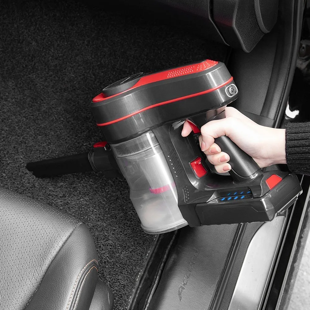 It has an exterior design with a nice black color and some other colors like red and gray. The BlitzWolf BW-AR182 2-in-1 Cordless Handheld Vacuum Cleaner is made of high-quality materials but they are quite lightweight, the net weight is only 1.4kg, but when fully assembled and all parts are included, its weight increases to 3.2kg. It is totally wireless so you do not have to worry about cables. This feature allows it to adapt to different situations because it has a 130° rotary head, easily twists to clean between tight spaces. So it can be used to clean the upholstery of furniture, cars, etc. But it can also clean the floor of your home.
