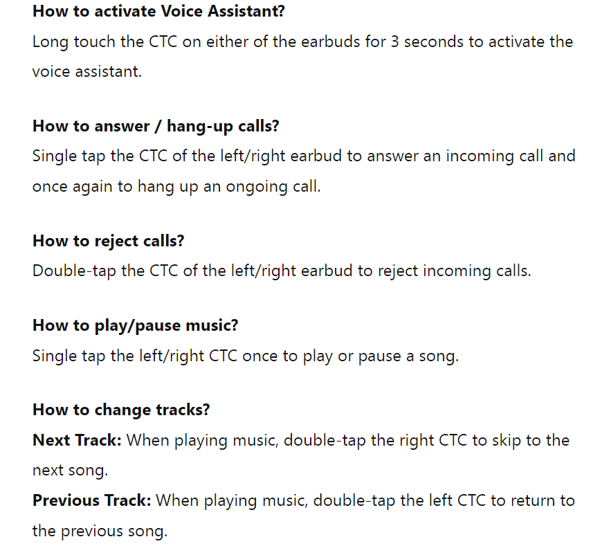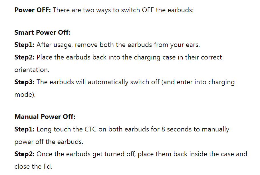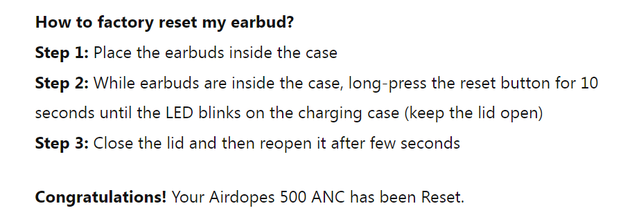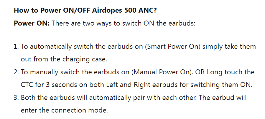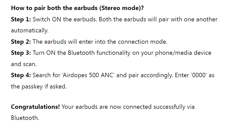 Home Audiophile Earbuds Manuals The boAt Airdopes 500 ANC earbuds come with specs such as Bluetooth 5.0 + EDR with the HSP, HFP, A2DPA, and AVRCP profiles, a battery life of up to 3.5 hours on a single charge, SBC codec support, 7mm drivers and built-in microphones in each earbud, the IPX4 dust and sweat-proof certification, and much more. Learn how to use these earbuds using this boAt Airdopes 500 ANC manual! If you are interested in purchasing these earbuds, you can easily do it using the boAt official website. Also, in case you are interested in giving the original manual a look, you can do it here. What's Inside ToggleboAt Airdopes 500 ANC Specs SheetboAt Airdopes 500 ANC AccessoriesboAt Airdopes 500 ANC Manual | Everything You Need To KnowHow To Wear These Earbuds?How To Turn On And Off?How To Control These Earbuds?How To Pair The Earbuds? – Dual ModeHow To Pair The Earbuds? – Single ModeHow To Reset And Re-Pair These Earbuds?How To Charge The Earbuds?What Do The Lights Mean?Do These Earbuds Have An App?Some Common Problems & TroubleshootingFAQs boAt Airdopes 500 ANC Specs Sheet ModelboAt Airdopes 500 ANCWeightEarbuds and charging case: Around 45 gramsWaterproof/IP ratings IPX4Bluetooth version V5.0Range/Distance10 metersConnectivity Port/Charging CableType-CAudio Decoding SBCDriver 7mmSpeaker frequency response20Hz – 20kHzBattery Life Earbuds: About 3.5 hours Charging case: About 20 hoursCharging Time Earbuds: Around 1.5 hours Charging case: About 2 hoursApp Support NoControls/Features Play and pause a song, play the next and previous song, answer, end, and reject a call, voice assistantAccessories Charging case, USB cable, user manual, warranty card, ear tips, FAQ card, catalogue, sticker, read me before use cardPriceAround 120 USD boAt Airdopes 500 ANC Accessories The earbuds come with the following accessories: Charging case. USB cable. User manual. Warranty card. Ear tips. FAQ card. Catalogue. Sticker. Read me before use card. Credits: DAYbyDAY Tech Credits: DAYbyDAY Tech Credits: DAYbyDAY Tech boAt Airdopes 500 ANC Manual | Everything You Need To Know How To Wear These Earbuds? Step 1: Take both earbuds out of the charging case. Step 2: Identify the left and right earbuds. Step 3: Choose the ear tips that best suit your ears. Step 4: Insert the headphones into the inner canal of the ears. Step 5: Rotate for the best possible comfort and best fit, and make sure that the microphone is pointing to the mouth. How To Turn On And Off? Turn On Automatically: Open the lid of the charging case and take the earbuds out. After that, the earbuds will turn on automatically. Manually: Press the capacitive touch control on both earbuds for about 3 seconds. After that, the earbuds will turn on. Turn Off Automatically: Place the earbuds into the charging case. After that, the earbuds will turn off automatically. Manually: Press the capacitive touch control on both earbuds for about 8 seconds. After that, the earbuds will turn off. How To Control These Earbuds? NOTE: The capacitive touch control is placed on the top part of the body of the earbuds. Play or pause a song: Press the capacitive touch control on any of the earbuds two times. Play the next song: Press the capacitive touch control on the right earbud two times. Play the previous song: Press the capacitive touch control on the left earbud two times. Answer an incoming call: Press the capacitive touch control on any of the earbuds one time. End a current call: Press the capacitive touch control on any of the earbuds one time. Reject an incoming call: Press the capacitive touch control on any of the earbuds two times. Activate the voice assistant: Press and hold the capacitive touch control on any of the earbuds for about 3 seconds. Volume cannot be controlled via earbuds and can only be adjusted using the connected phone/media device. How To Pair The Earbuds? – Dual Mode To Android And iOS Devices Step 1 Open the lid of the charging case and take the earbuds out. After that, the earbuds will turn on automatically and pair with each other. The earbuds will now be ready to pair with any device. Step 2: Unlock the desired device. Step 3: Go to the device’s settings. Step 4: Turn on Bluetooth on the desired device. Step 5: Search for a new device. Step 6: Select the Airdopes 500 ANC earbuds. If a password is needed, type “0000” or “1234”. After that, the pairing will be done. To Windows (PC) Step 1: Turn on the Window’s Bluetooth. Step 2: Go to the settings. Step 3: Go to “Bluetooth and other devices”. Step 4: Click on “Add device”. Step 5: Click on Bluetooth. Step 6: Open the lid of the charging case and take the earbuds out. After that, the earbuds will turn on automatically and pair with each other. The earbuds will now be ready to pair with any device. Step 7: Select the Airdopes 500 ANC earbuds. If a password is needed, type “0000” or “1234”. After that, the pairing will be done. How To Pair The Earbuds? – Single Mode Step 1: Open the lid of the charging case and take the selected earbud out. After that, it will turn on. The earbuds will now be ready to pair with any device. Step 2: Unlock the desired device. Step 3: Go to the device’s settings. Step 4: Turn on Bluetooth on the desired device. Step 5: Search for a new device. Step 6: Select the Airdopes 500 ANC earbud. If a password is needed, type “0000” or “1234”. After that, the pairing will be done. NOTE: To switch to Stereo mode, simply take out the other earbud from the case. It will automatically power on and pair with the previously selected earbud, hence enabling Stereo (dual) usage. How To Reset And Re-Pair These Earbuds? NOTE: To ensure a good result, make sure that the earbuds are fully charged. Step 1: Place the earbuds into the charging case and keep the lid open. Step 2: Press and hold the reset button on the charging case for about 10 seconds, and light starts flashing on the case. This will reset the earbuds. Step 3: Clos