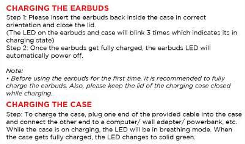 • Said lights turn off while on the charging case: The earbuds are fully charged.