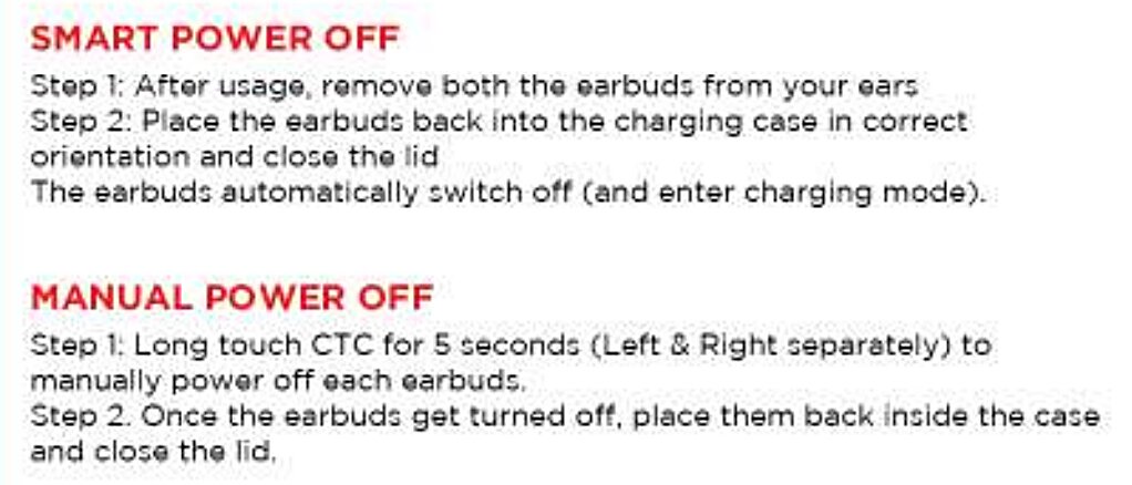 Manually: Press and hold the capacitive touch control on both earbuds for 5 seconds. After that, the earbuds will turn off.