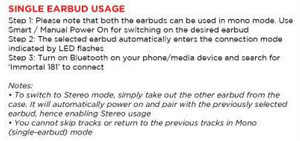 NOTE: To switch to Stereo mode, simply take out the other earbud from the case. It will automatically power on and pair with the previously selected earbud, hence enabling Stereo (dual) usage. Also, you can’t skip or return to the previous song in single mode.