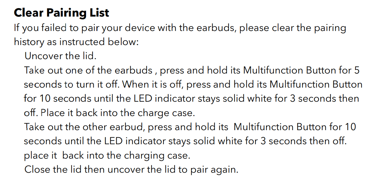 Home Audiophile Earbuds Manuals The Boltune BT-BH020 earbuds come with specs such as Bluetooth 5.0 with 10 to 12 meters of working range, 6mm diameter dynamic drivers, CVC 8.0 noise canceling technology support, a battery life of about 4 hours, built-in microphones, the IPX5 sweat and dust-proof certification, and much more. Learn how to use these earbuds using this manual! What's Inside ToggleBoltune BT-BH020 | This Is All You Have To KnowHow to Pair The Earbuds?How to Wear?How to Turn On and Off?How to Control? / How to Operate? – InstructionsHow to Activate The Mono Mode?How to Charge The Earbuds?How to Clear The Pairing List?What Do The Lights Mean?Some Common Problems & TroubleshootingFAQs Boltune BT-BH020 | This Is All You Have To Know How to Pair The Earbuds? To Android And iOS Devices Step 1: Open the lid of the charging case. After that, the earbuds will turn on automatically and pair with each other. When a blue and white light starts flashing, the earbuds will be ready to pair with any device. Step 2: Unlock the desired device. Step 3: Turn on Bluetooth on the desired device. Step 4: Go to the device’s Bluetooth settings. Step 5: Select the “Boltune BT-BH020” earbuds. If a password is needed, write “0000”. After that, a blue light will flash blue slowly, and the pairing will be done. To PC (Windows) Step 1: Open the lid of the charging case. After that, the earbuds will turn on automatically and pair with each other. When a blue and white light starts flashing, the earbuds will be ready to pair with any device. Step 2: Unlock the desired device. Step 3: Go to the Settings. Step 4: Go to “Bluetooth and other devices”. Step 5: Turn on Bluetooth on the device. Step 6: Click on “Add device”. Step 7: Select the “Boltune BT-BH020” earbuds. If a password is needed, write “0000”. After that, a blue light will flash blue slowly, and the pairing will be done. How to Wear? Step 1: Take both earbuds out of the charging case. Step 2: Identify the left and right earbuds. Step 3: Choose the ear tips that best suit your ears. Step 4: Insert the headphones into the inner canal of the ears. Step 5: Rotate for the best possible comfort and best fit, and make sure that the microphone is pointing to the mouth. How to Turn On and Off? Turn on: Open the lid of the charging case. After that, the earbuds will turn on automatically. Turn off: Place the earbuds into the charging case and close its lid. After that, the earbuds will turn off automatically. Also, you can press and hold the multifunction touch button on both earbuds for about 5 seconds. How to Control? / How to Operate? – Instructions Play or pause music: Press the multifunction touch button on any of the earbuds two times. Play the next song: Press the multifunction touch button on the right earbud three times. Play the previous song: Press the multifunction touch button on the left earbud three times. Turn the volume up: Press the multifunction touch button on the right earbud one time. Turn the volume down: Press the multifunction touch button on the left earbud one time. Answer an incoming call: Press the multifunction touch button on any of the earbuds one time. End a current call: Press and hold the multifunction touch button on any of the earbuds for about 2 seconds. Reject an incoming call: Press and hold the multifunction touch button on any of the earbuds for about 2 seconds. Redial: Press the multifunction touch button on any of the earbuds three times in a non-music playback state. Activate the voice control: Press and hold the multifunction touch button on any of the earbuds for about 1.5 seconds, until a beep is heard. How to Activate The Mono Mode? To activate or deactivate the mono mode in these earbuds, all you have to do is to pair the earbuds to the device and take out one of the earbuds from the charging case. It will start working by itself. How to Charge The Earbuds? Earbuds To charge the earbuds, all you have to do is to place them into the charging case and close the lid. The earbuds will start charging automatically. Charging case To charge the charging case, all you have to do is to connect the case to a USB charger or charging port with the included USB-A to C cable. It will start charging automatically. How to Clear The Pairing List? Step 1: Open the lid of the charging case. After that, the earbuds will turn on automatically. Step 2: Take one of the earbuds out of the charging case. Step 3: Press and hold the multifunction touch button on said earbud for about 5 seconds. This will turn it off. Step 4: While being off, press and hold the multifunction touch button on said earbud for about 10 seconds, until a white light stays on for 3 seconds. Step 5: Place said earbud into the charging case. Step 6: Take the second earbud out of the charging case. Step 7: Press and hold the multifunction touch button on said earbud for about 5 seconds. This will turn it off. Step 8: While being off, press and hold the multifunction touch button on said earbud for about 10 seconds, until a white light stays on for 3 seconds. Step 9: Place said earbud into the charging case. Step 10: Close the lid of the charging case. After that, the process will be done. What Do The Lights Mean? Earbuds A blue and white light flashing: The earbuds are now in pairing mode. A blue light flashing slowly: The earbuds are now connected. A white light on for 3 seconds: The pairing list is being cleared. Charging case One light on while charging: The case has about 25% of battery. Two lights on while charging: The case has about 50% of battery. Three lights on while charging: The case has about 75% of battery. Four lights on while charging: The case has about 100% of battery. Some Common Problems & Troubleshooting Left / Right / One side of the earbuds has stopped working If this happens, it may be because it is low on battery or it did not connect correctly with the device. To fix this, you can do the following: 1. Try ch