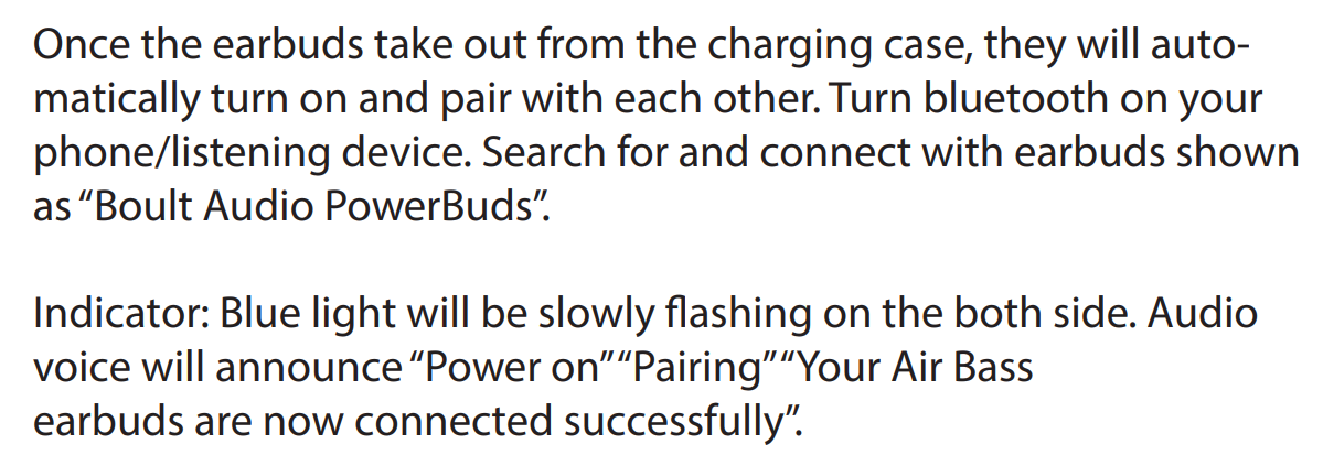 Home Audiophile Earbuds Manuals The Boult AirBass Powerbuds earbuds come with specs such as the amazing IPX7 waterproof certification, Bluetooth 5.0, a 2200mAh integrated battery that can be used as a power bank, a working distance of 10 to 15 meters, a battery life of 7 hours + a total playtime of 120 hours using the charging case, and much more. Learn how to use these earbuds using this manual! What's Inside ToggleBoult AirBass Powerbuds Manual | All You Have To KnowHow To Wear These Earbuds?How To Turn On And Off?How To Pair The Earbuds?How To Control These Earbuds? – Stereo ModeHow To Activate The Mono Mode?How To Charge The Earbuds?How To Clear The Pairing Record?Resume The Pairing Process Of The EarbudsThe Earbuds’ Voice PromptsWhat Does The Lights Mean?Some Common Problems & TroubleshootingFAQs Boult AirBass Powerbuds Manual | All You Have To Know How To Wear These Earbuds? Step 1: Take both earbuds out of the charging case. Step 2: Identify the left and right earbuds. Step 3: Choose the ear tips that best suit your ears. Step 4: Insert the headphones into the inner canal of the ears. Step 5: Rotate for the best possible comfort and best fit, and make sure that the microphone is pointing to the mouth. How To Turn On And Off? Turn On Automatically: Open the lid of the charging case and take the earbuds out. After that, the “Power on” voice prompt will sound, and the earbuds will turn on automatically. Manually: Press and hold the multifunction touch area on both earbuds for about 2 seconds. After that, the “Power on” voice prompt will sound, and the earbuds will turn on. Turn Off Automatically: Place the earbuds into the charging case. After that, the earbuds will turn off automatically. Manually: Press and hold the multifunction touch area on both earbuds for about 5 seconds. After that, the earbuds will turn off. How To Pair The Earbuds? To Android Or iOS Devices Step 1: Open the lid of the charging case and take the earbuds out. After that, the “Power on” voice prompt will sound, and the earbuds will turn on automatically. NOTE: If the earbuds don’t turn on automatically, then press and hold the multifunction touch area on both earbuds for about 2 seconds. After that, the “Power on” voice prompt will sound, and the earbuds will turn on and pair with each other. When a blue light starts flashing on both earbuds, they will be ready to pair with any device. Step 2: Unlock the desired device. Step 3: Go to the device’s settings. Step 4: Turn on Bluetooth on the desired device. Step 5: Search for a new device. Step 6: Select the Boult Audio PowerBuds earbuds. If a password is needed, type “0000”. The “Pairing” voice prompt will sound. After that, the “Your Air Bass earbuds are now connected successfully” voice prompt will sound, and the pairing will be done. To Windows (PC) Step 1: Turn on Window’s Bluetooth. Step 2: Go to the settings. Step 3: Go to “Bluetooth and other devices”. Step 4: Click on “Add device”. Step 5: Click on Bluetooth. Step 6: Open the lid of the charging case and take the earbuds out. After that, the “Power on” voice prompt will sound, and the earbuds will turn on automatically. NOTE: If the earbuds don’t turn on automatically, then press and hold the multifunction touch area on both earbuds for about 2 seconds. After that, the “Power on” voice prompt will sound, and the earbuds will turn on and pair with each other. When a blue light starts flashing on both earbuds, they will be ready to pair with any device. Step 7: Select the Boult Audio PowerBuds earbuds. If a password is needed, type “0000”. The “Pairing” voice prompt will sound. After that, the “Your Air Bass earbuds are now connected successfully” voice prompt will sound, and the pairing will be done. How To Control These Earbuds? – Stereo Mode Play or pause a song: Press the multifunction touch area on any of the earbuds two times. Play the next song: While listening to music, press and hold the multifunction touch area on the right earbud for about 2 seconds. Play the previous song: While listening to music, press and hold the multifunction touch area on the left earbud for about 2 seconds. Answer an incoming call: Press the multifunction touch area on any of the earbuds two times. End a current call: Press the multifunction touch area on any of the earbuds two times. Reject an incoming call: With an incoming call, press and hold the multifunction touch area on any of the earbuds for about 1 second. Activate the voice assistant: Press the multifunction touch area on any of the earbuds 3 times. How To Activate The Mono Mode? To activate or deactivate the mono mode in these earbuds, all you have to do is to pair the earbuds to the device and take out one of the earbuds from the charging case. It will start working by itself. How To Charge The Earbuds? Earbuds To charge the earbuds, all you have to do is to place them into the charging case. The earbuds will start charging automatically. Charging Case To charge the charging case, all you have to do is to connect the case to a USB charger or charging port. It will start charging automatically. How To Clear The Pairing Record? Step 1: Delete all the Boult Audio PowerBuds earbuds pairing records from the connected device. Step 2: Take the earbuds out of the charging case. After that, the “Power on” voice prompt will sound, and the earbuds will turn on automatically. Step 3: Press the multifunction touch area on both earbuds 5 times. This will clear the pairing record of the earbuds. Step 4: Search for a new device. Step 5: Select the Boult Audio PowerBuds earbuds. If a password is needed, type “0000”. The “Pairing” voice prompt will sound. After that, the “Your Air Bass earbuds are now connected successfully” voice prompt will sound, and the pairing will be done. Resume The Pairing Process Of The Earbuds In case there was a pairing issue, or the blue light never starts flashi
