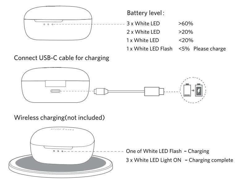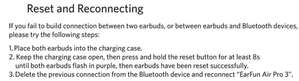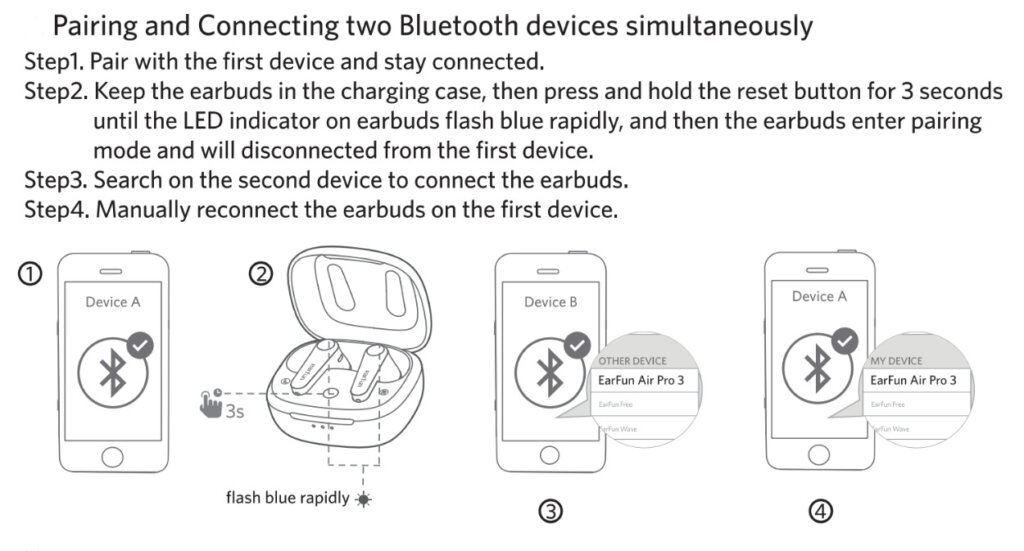 Home Audiophile Earbuds Manuals The EarFun Air Pro 3 come with specs such as 9 hours of battery life + 36 hours using the charging case (ANC off), and 7 hours of battery life + 30 hours using the charging case (ANC on), Bluetooth 5.3, a total of 6 integrated microphones, the IPX5 dust and sweat-proof certification, and much more. Learn how to use these earbuds using this EarFun Air Pro 3 manual! If you are interested in purchasing these earbuds, you can easily do it using the EarFun official website and Amazon. In case you want to give the original manual a look, you can do it here. What's Inside ToggleEarFun Air Pro 3 Specs SheetEarFun Air Pro 3 AccessoriesEarFun Air Pro 3 | Step-by-step Earbuds Manual How to Pair The Earbuds?How to Connect To A New Device?Pairing and Connecting Two Devices SimultaneouslyHow to Wear?How to Turn On and Off?How to Control? / How to Operate? – InstructionsHow to Use The ANC Mode?How to Activate The Mono Mode?How to Charge The Earbuds?How to Reset And Reconnect The Earbuds?What Do The Lights Mean?A Guide To The EarFun Air Pro 3 AppHow To Update The Earbuds Firmware?Some Common Problems & TroubleshootingFAQs EarFun Air Pro 3 Specs Sheet ModelEarFun Air Pro 3WeightEarbuds: 5 grams each Charging case: 43 gramsWaterproof/IP ratings IPX5Bluetooth version V5.3Range/Distance10 metersDriver11mmAudio DecodingAACConnectivity Port/Charging CableType-CSpeaker frequency response20Hz – 20kHzBattery Life Earbuds: About 7 hours (ANC on)/ About 9 hours (ANC off) Charging case: About 30 hours (ANC on)/ About 36 hours (ANC off)Charging Time Earbuds: About 1 hour Charging time: About 2 hoursApp Support Yes, EarFun AudioControls/Features Play or pause music, play the next and previous song, turn the volume up and down, answer, end, and reject a call, voice assistant, answer and transfer two calls to the connected device, ANCAccessories Charging case, user manual, USB cable, ear tipsPriceAbout 80 USD EarFun Air Pro 3 Accessories The earbuds come with the following accessories: Charging case. User manual. USB cable. Ear tips. EarFun Air Pro 3 | Step-by-step Earbuds Manual How to Pair The Earbuds? To Android And iOS Devices Step 1: Open the lid of the charging case. After that, a blue light will flash for about 1 second, and the earbuds will turn on automatically. When a blue light starts flashing on the earbuds, it means that they will be ready to pair with any device. Step 2: Unlock the desired device. Step 3: Turn on Bluetooth on the desired device. Step 4: Go to the device’s Bluetooth settings. Step 5: Select the “EarFun Air Pro 3” earbuds. If a password is needed, type “0000”. After that, the flashing blue light will turn off, and the pairing will be done. To PC (Windows) Step 1: Unlock the desired device. Step 2: Turn on Bluetooth on the device. Step 3: Go to the Settings. Step 4: Go to “Bluetooth and other devices”. Step 5: Click on “Add device”. Step 6: Open the lid of the charging case. After that, a blue light will flash for about 1 second, and the earbuds will turn on automatically. When a blue light starts flashing on the earbuds, it means that they will be ready to pair with any device. Step 7: Select the “EarFun Air Pro 3” earbuds. If a password is needed, type “0000”. After that, the flashing blue light will turn off, and the pairing will be done. Credits: EarFun How to Connect To A New Device? To connect these earbuds to a new device, you have two options to follow: Option A Step 1: Open the lid of the charging case. After that, a blue light will flash for about 1 second, and the earbuds will turn on automatically. Step 2: Go to the Bluetooth settings of the connected device. Step 3: Delete the “EarFun Air Pro 3” earbuds. This will unpair the earbuds from the device they are connected to. When a blue light starts flashing on the earbuds, it means that they will be ready to pair with any device. Step 4: Unlock the new desired device. Step 5: Turn on Bluetooth on the desired device. Step 6: Go to the device’s Bluetooth settings. Step 7: Select the “EarFun Air Pro 3” earbuds. If a password is needed, type “0000”. After that, the flashing blue light will turn off, and the pairing will be done. Credits: EarFun Option B Step 1: Place the earbuds into the charging case and make sure that they are in charging mode. Step 2: With the lid of the case open, press and hold the button on the inside of the charging case for about 3 seconds, until the light on the earbuds starts flashing blue quickly. This means that they are now in pairing mode. Step 3: Unlock the new desired device. Step 4: Turn on Bluetooth on the desired device. Step 5: Go to the device’s Bluetooth settings. Step 6: Select the “EarFun Air Pro 3” earbuds. If a password is needed, type “0000”. After that, the flashing blue light will turn off, and the pairing will be done. Credits: EarFun Pairing and Connecting Two Devices Simultaneously These earbuds support a two-device connection, and all you have to do is to follow the following steps: Step 1: Pair the earbuds with the first device as shown in the pairing section above. Step 2: Keep the earbuds in the charging case. Step 3: Press and hold the button on the inside of the charging case for about 3 seconds, until the light on the earbuds starts flashing blue quickly. This means that they are now in pairing mode and will disconnect from the first device. Step 4: Pair the earbuds with the second device as shown in the pairing section above. Step 5: Manually reconnect the earbuds on the first device. Credits: EarFun How to Wear? Step 1: Take both earbuds out of the charging case. Step 2: Identify the left and right earbuds. Step 3: Choose the ear tips that best suit your ears. Step 4: Insert the headphones into the inner canal of the ears. Step 5: Rotate for the best possible comfort and best fit, and make sure that the microphone is pointing to the mouth. How to Turn On and Off? Turn on: Open the lid of the ch