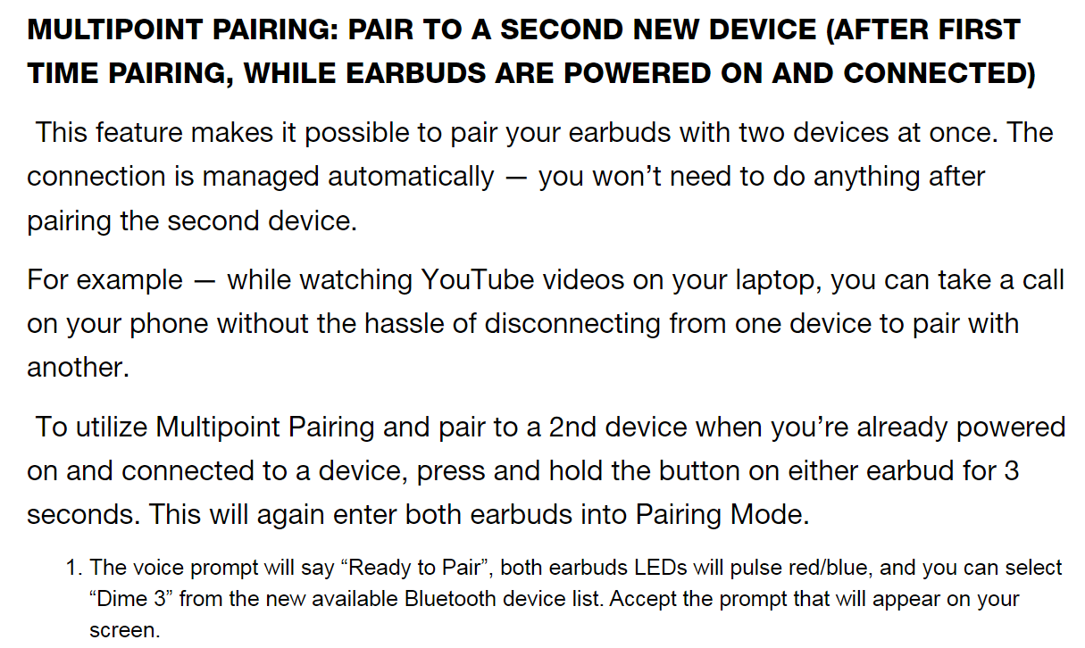 NOTE: This process is to pair the earbuds to a second new device after the first time pairing, while the earbuds are powered on and connected.