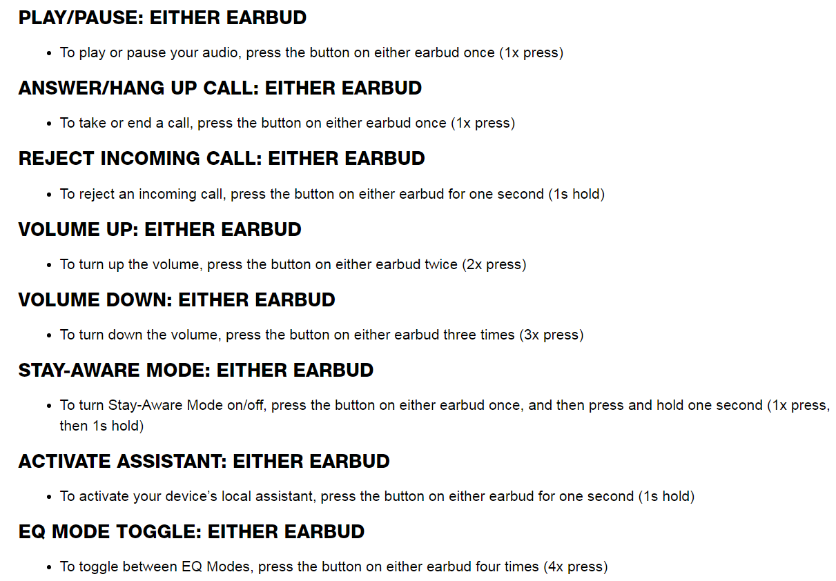 Controls/Features         Play and pause a song, answer, end, and reject a call, turn the volume up and down, Stay-Aware mode, voice assistant, change EQ modes