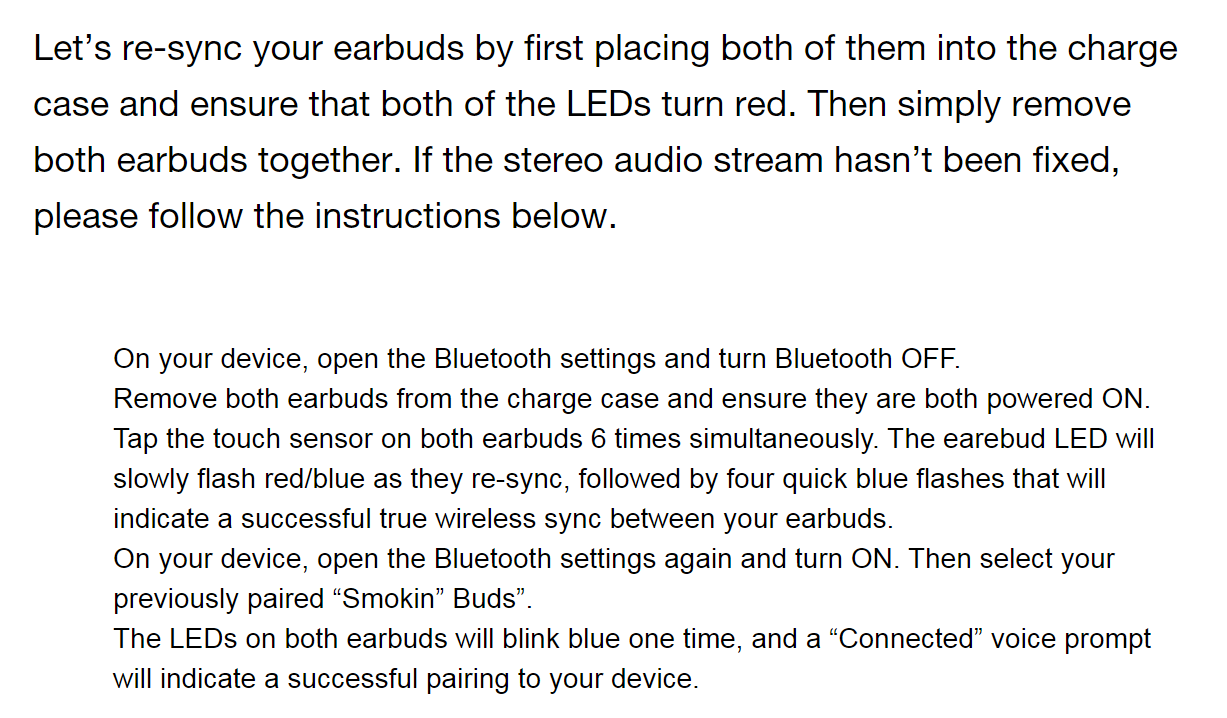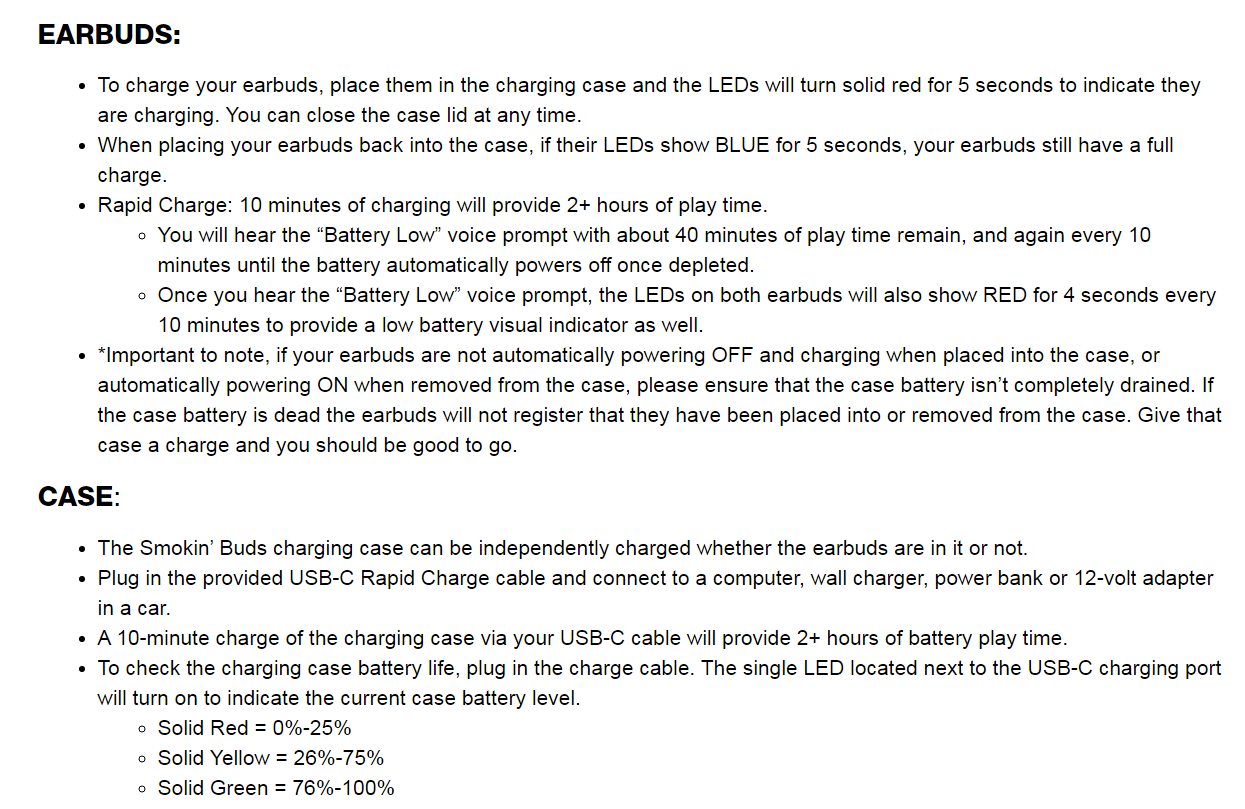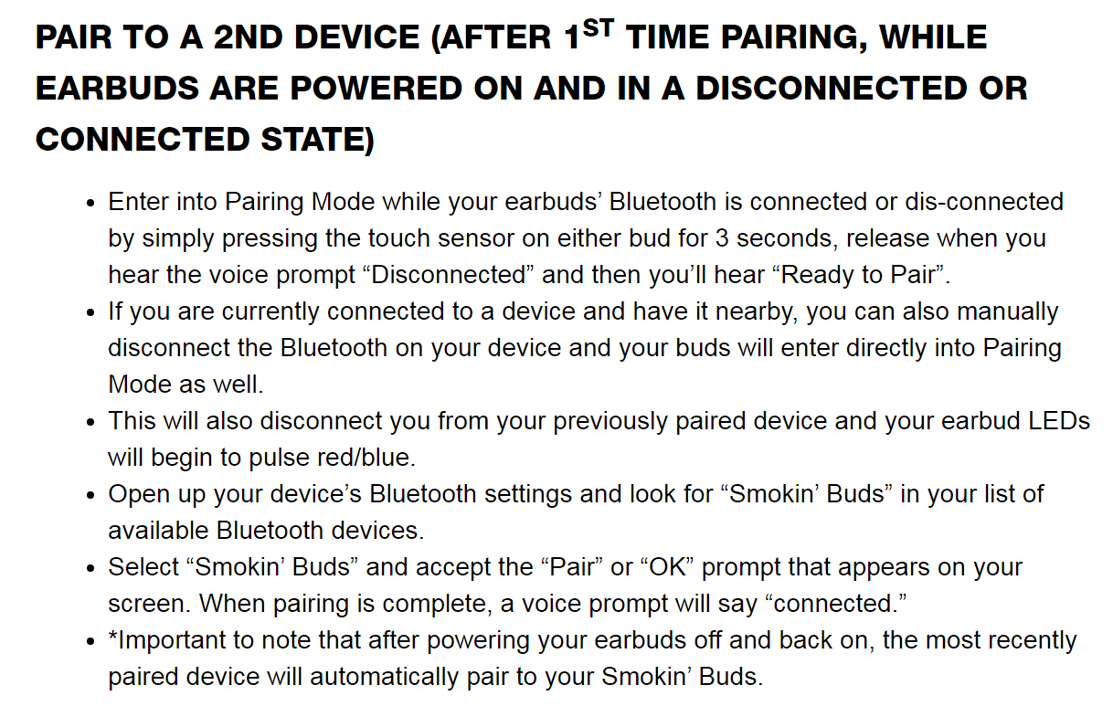 Home Audiophile Earbuds Manuals The Skullcandy Smokin’ Buds earbuds come with specs such as 3 specialized EQ modes (Music, Movie and Podcast), a battery life of 8 hours + 12 hours using the charging case, Rapid Charge support (10 minutes = 2 hours of playtime), Bluetooth 5.2, the IPX4 dust and sweat-proof certification, and much more. Learn how to use these earbuds using this Skullcandy Smokin’ Buds manual! If you are interested in purchasing these earbuds, you can easily do it using the Skullcandy official website. Also, if you want to give the original manual a look, you can do it here. What's Inside ToggleSkullcandy Smokin’ Buds Specs SheetSkullcandy Smokin’ Buds AccessoriesSkullcandy Smokin’ Buds Manual & InstructionsHow To Wear These Earbuds?How To Turn On And Off?How To Pair The Earbuds?How To Re-Sync The Earbuds?Pairing To A Second DeviceHow To Control These Earbuds? – Stereo ModeHow To Activate The Mono Mode?How To Charge The Earbuds?How To Reset The Paired Device List?The Earbuds’ Voice PromptsWhat Does The Lights Mean?Do These Earbuds Have An App?Some Common Problems & TroubleshootingFAQs Skullcandy Smokin’ Buds Specs Sheet ModelSkullcandy Smokin’ BudsWeightEarbuds and charging case: 40.5 grams Waterproof/IP ratings IPX4Bluetooth version V5.2Range/Distance10 metersDriver6mmAudio DecodingAACConnectivity Port/Charging CableType-CSpeaker frequency response20Hz – 20kHzBattery Life Earbuds: About 8 hours Charging case: About 12 hoursCharging Time Earbuds: About 1 hour Charging case: About 1.5 hoursApp Support NoControls/Features Play or pause music, turn the volume up and down, answer and end a call, voice assistant, change between EQ modesAccessories Charging case, user manual, USB cable, ear tipsPriceAbout 25 USD Skullcandy Smokin’ Buds Accessories The earbuds come with the following accessories: Charging case. User manual. USB cable. Ear tips. Credits: RTings Skullcandy Smokin’ Buds Manual & Instructions How To Wear These Earbuds? Step 1: Take both earbuds out of the charging case. Step 2: Identify the left and right earbuds. Step 3: Choose the ear tips that best suit your ears. Step 4: Insert the headphones into the inner canal of the ears. Step 5: Rotate for the best possible comfort and best fit, and make sure that the microphone is pointing to the mouth. How To Turn On And Off? Turn On Automatically: Open the lid of the charging case and take the earbuds out. After that, a “ping” tone will sound, a blue light will be on for 2 seconds, and they will turn on automatically. Manually: Press and hold the multifunction touch area on both earbuds for about 1 second. Turn Off Automatically: Place the earbuds into the charging case. After that, the earbuds will turn off automatically. Manually: Press the multifunction touch area on both earbuds two times, and then press and hold for about 1 second. How To Pair The Earbuds? To Android Or iOS Devices Step 1: Remove the stickers covering the charging points on both earbuds and place them into the charging case. Make sure that there is a red light on the earbuds, meaning that they are charging. Step 2: Open the lid of the charging case and take the earbuds out. After that, a “ping” tone will sound, a blue light will be on for 2 seconds, and they will turn on automatically. If they don’t turn on, then press and hold the multifunction touch area on both earbuds for about 1 second. When a red and blue light starts flashing on the earbuds, and the “Ready to pair” voice prompt is heard, the earbuds will be ready to pair with any device. NOTE: If the earbuds don’t enter pairing mode automatically, then press and hold the multifunction touch area on both earbuds for about 3 seconds, until a red and blue light starts flashing on the earbuds, and the “Ready to pair” voice prompt is heard. This will activate the manual pairing mode. Step 3: Unlock the desired device. Step 4: Go to the device’s settings. Step 5: Turn on Bluetooth on the desired device. Step 6: Search for a new device. Step 7: Select the Smokin’ Buds earbuds. If a password is needed, type “0000”. After that, the “Connected” voice prompt will sound, and the pairing will be done. To Windows (PC) Step 1: Turn on the Window’s Bluetooth. Step 2: Go to the settings. Step 3: Go to “Bluetooth and other devices”. Step 4: Click on “Add device”. Step 5: Click on Bluetooth. Step 6: Remove the stickers covering the charging points on both earbuds and place them into the charging case. Make sure that there is a red light on the earbuds, meaning that they are charging. Step 7: Open the lid of the charging case and take the earbuds out. After that, a “ping” tone will sound, a blue light will be on for 2 seconds, and they will turn on automatically. If they don’t turn on, then press and hold the multifunction touch area on both earbuds for about 1 second. When a red and blue light starts flashing on the earbuds, and the “Ready to pair” voice prompt is heard, the earbuds will be ready to pair with any device. NOTE: If the earbuds don’t enter pairing mode automatically, then press and hold the multifunction touch area on both earbuds for about 3 seconds, until a red and blue light starts flashing on the earbuds, and the “Ready to pair” voice prompt is heard. This will activate the manual pairing mode. Step 8: Select the Smokin’ Buds earbuds. If a password is needed, type “0000”. After that, the “Connected” voice prompt will sound, and the pairing will be done. How To Re-Sync The Earbuds? If there is missing audio in one of the earbuds, then re-sync them. To do this, all you have to do is to place them into the charging case and close its lid for about 2 seconds; when removed, both earbuds should play audio. With that being said, if that doesn’t happen, then do the following steps: Step 1: Go to the device’s settings and turn off Bluetooth. Step 2: Place the earbuds into the charging case and keep the lid ope