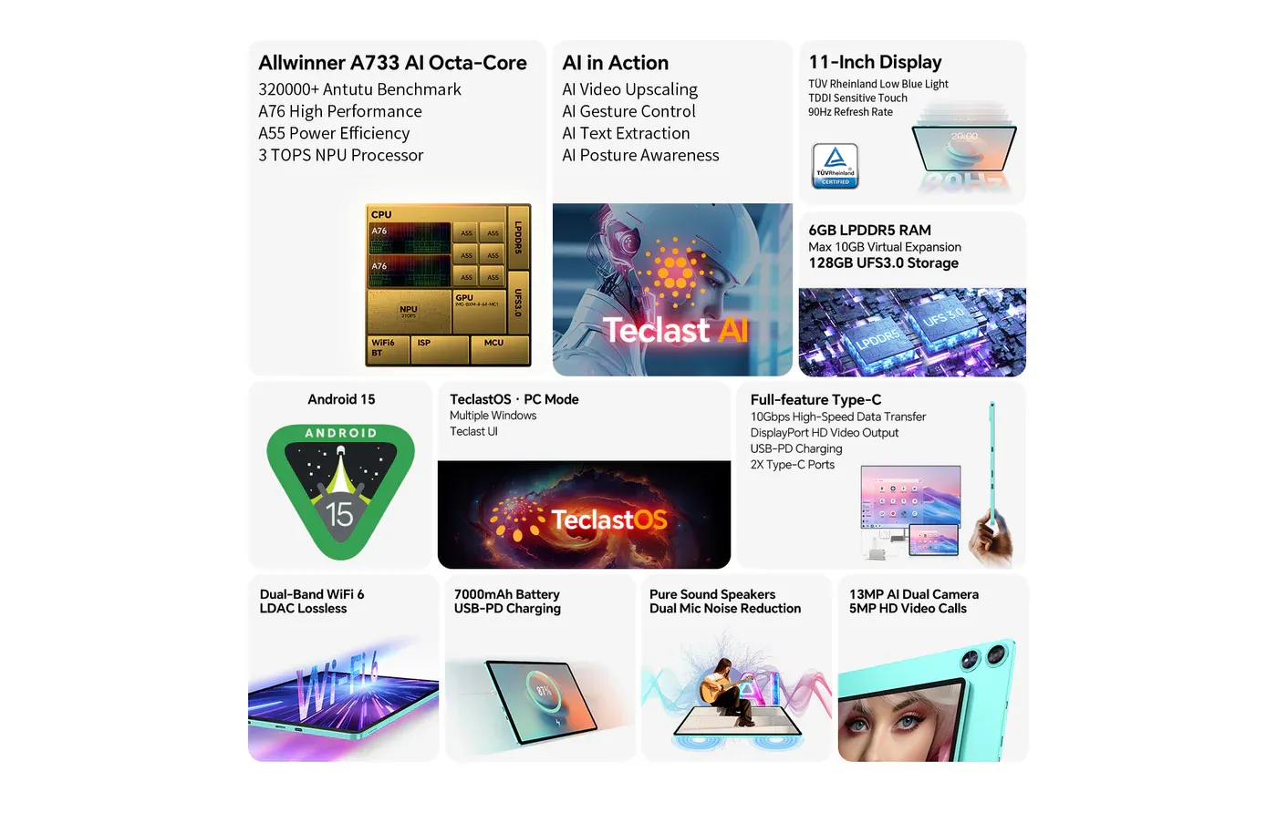 Home Latest News News Highlights Teclast P50AI is priced at 679 yuan ($93) It’s an 11-inch tablet with HD resolution and a 90Hz refresh rate Allwinner A733 powers the tablet with 6GB RAM and 128GB storage Runs on Android 15 P50AI has two Type-C ports which can be used simultaneously The main port is USB Type 3.1 and can be docked to a monitor Teclast P50AI is official for a price of starting price of 679 yuan ($93) in China and 108-110 USD internationally. This is the cheapest Teclast 11″ tablet to date and possibly the cheapest 11″ tablet. Teclast P50AI Tablet Specs Teclast P50AI uses a 10.92-inch screen, 1280 x 800 pixels HD resolution, and 90Hz refresh rate. On the front, it has a 5MP selfie camera embedded in the vertical middle frame. The borders are 8.3mm thick. Meanwhile, on the back is a dual 13MP + 0.08MP camera module. The overall weight is 540 grams. It is equipped with an AI-enabled Allwinner A733 octa-core processor running at 1.79 GHz (2 x Cortex-A76 cores, 6 x Cortex-A55 cores, and 1 x RISC-V E902 core). The memory and storage combination is 6 + 128GB. A 7000mAh battery powers the tablet, and it comes with Android 15 OS. The greatest highlight of Teclast P50AI is that it comes with two Type-C interfaces that can be used simultaneously. The main port can achieve 10Gbps high-speed data transmission + DisplayPort high-definition audio and video output + USB-PD protocol charging and also supports many functions such as an external USB expansion dock. Teclast, Aliexpress, Amazon